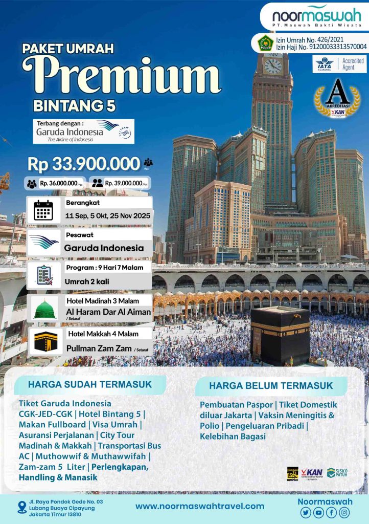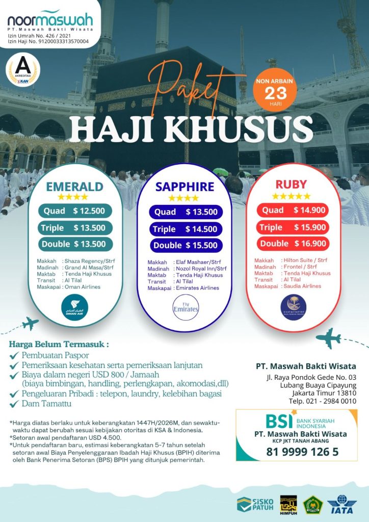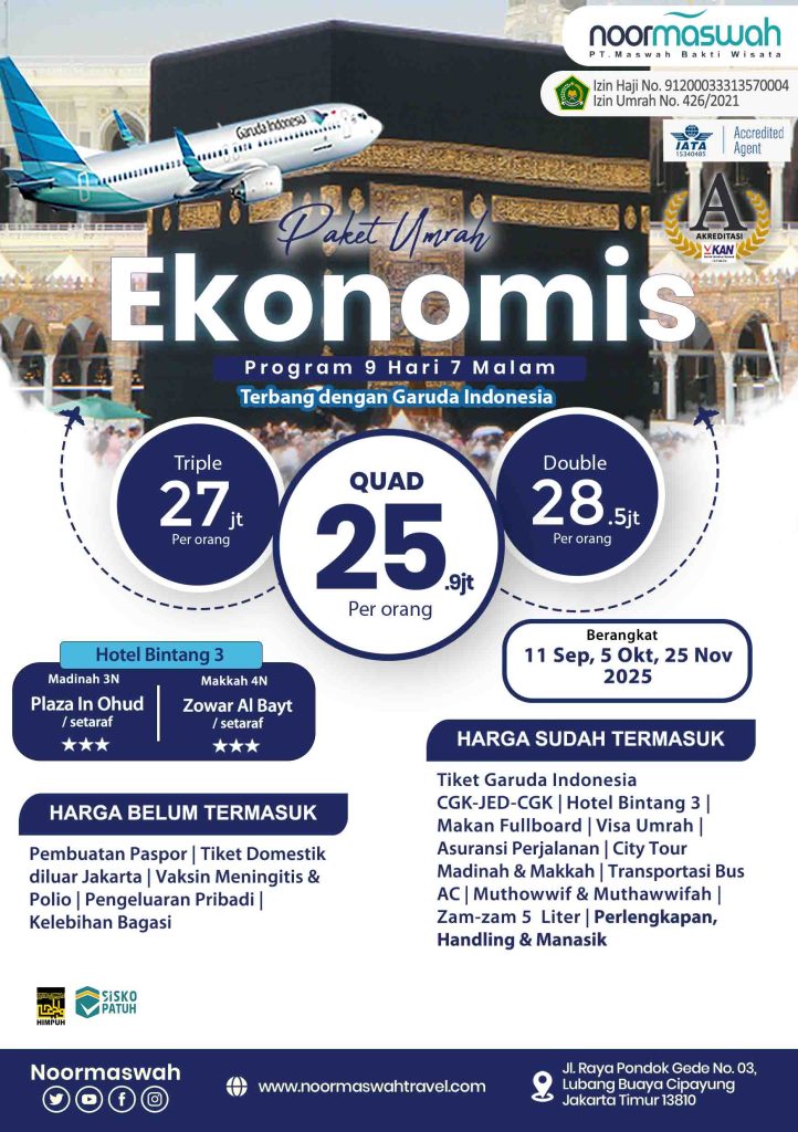 Noormaswah Travel adalah badan usaha yang lahir untuk memenuhi kebutuhan masyarakat akan travel umrah yang terpercaya dan profesional. Melalui layanan yang berkualitas dan pengembangan yang berkelanjutan, Maswah Travel selalu berusaha untuk bisa menjadi jawaban atas kebutuhan paket perjalanan umrah yang amanah.